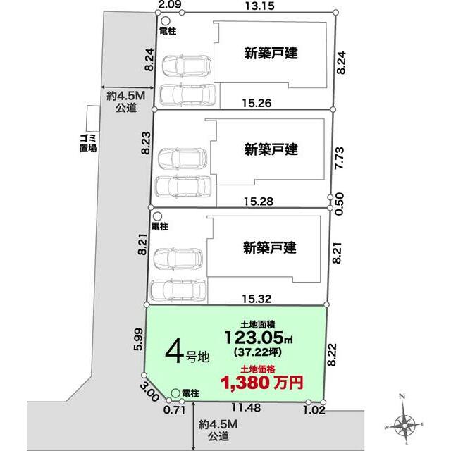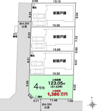 | 土地面積 | 実測 123.05㎡ | 坪数 | 37.22坪 | 坪単価 | 37.08万円 |